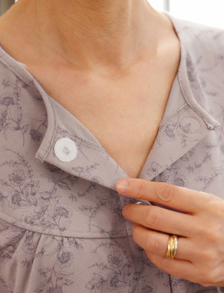 ◎点滴時などのシーンを想定し、袖口にも丸型ワンタッチテープを