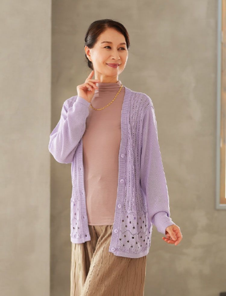 商品について ◎涼しげな透かし柄を施した色鮮やかなカーディガンです