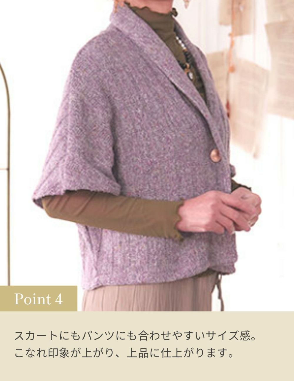 スカートにもパンツにも合わせやすいサイズ感。こなれ印象が上がり、上品に仕上がります。